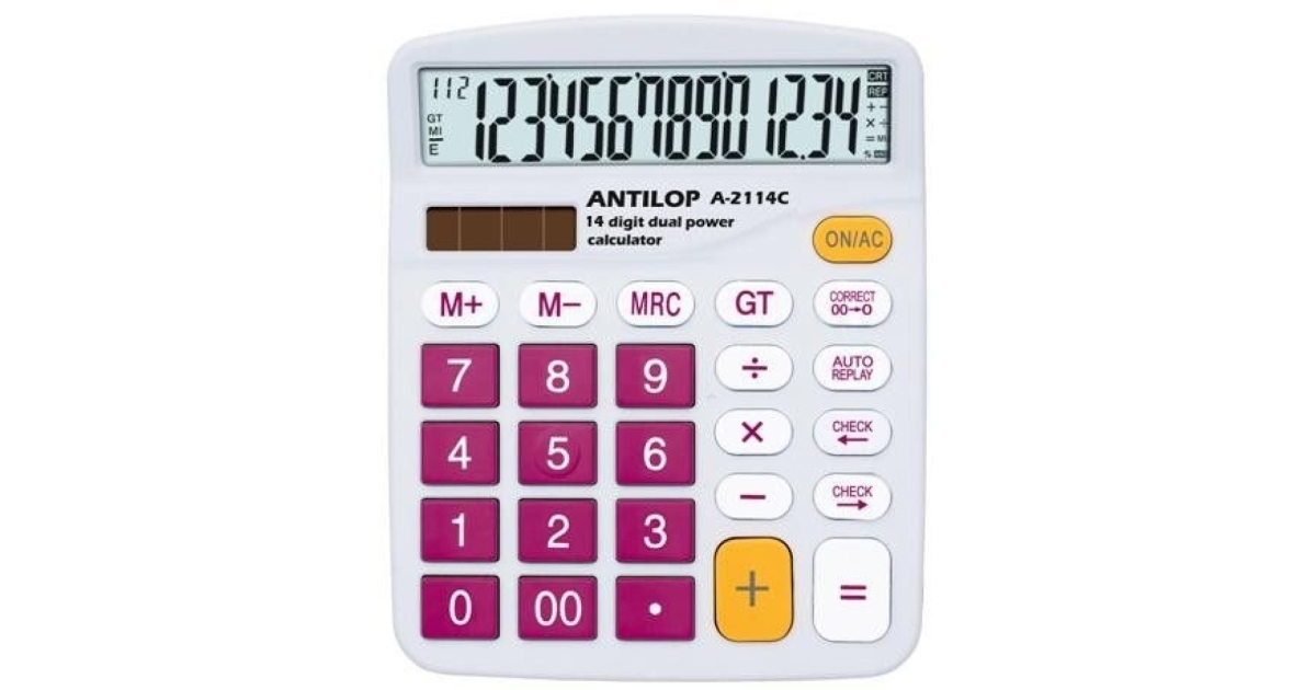 Antilop A-2114C színes asztali számológép 14 számjegyű nagy kijelző, memória funkció, GT, műveletek közötti előre és vissza léptetés, auto replay, 00 javítás 0-ra, és alapműveletek.
