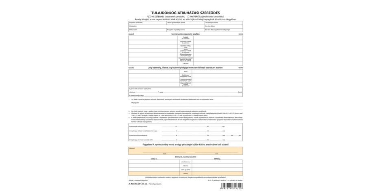 Új adásvételi szerződés gépjármű vásárlásához. 4 példányos nyomtatvány. A/4-es méretű vegykezelt papírból. Indigó használata nem szükséges.