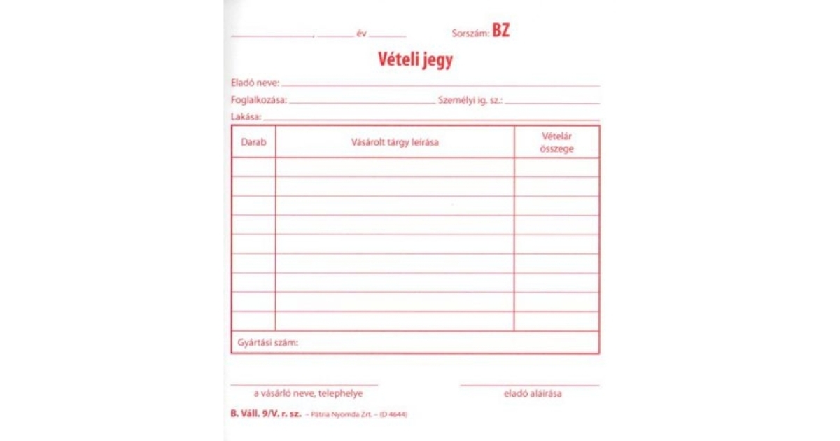 B.Váll.9/V Vételi jegy 50x2 példányos