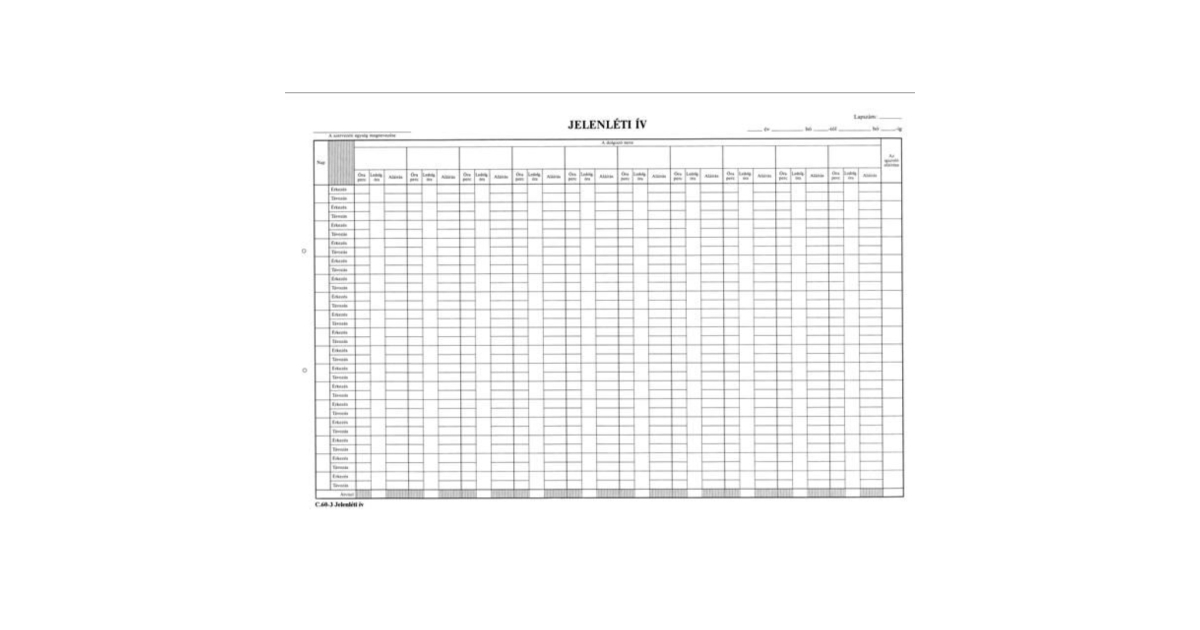 Általánosan használt jelenléti ív, havi használatra, 10 dolgozóra. Méret: A/3, 80 gr-os papírból készült.