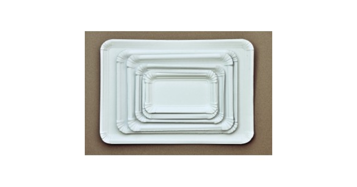 Egyszer használatos, fehér színű, téglalap alakú cukrásztálca.