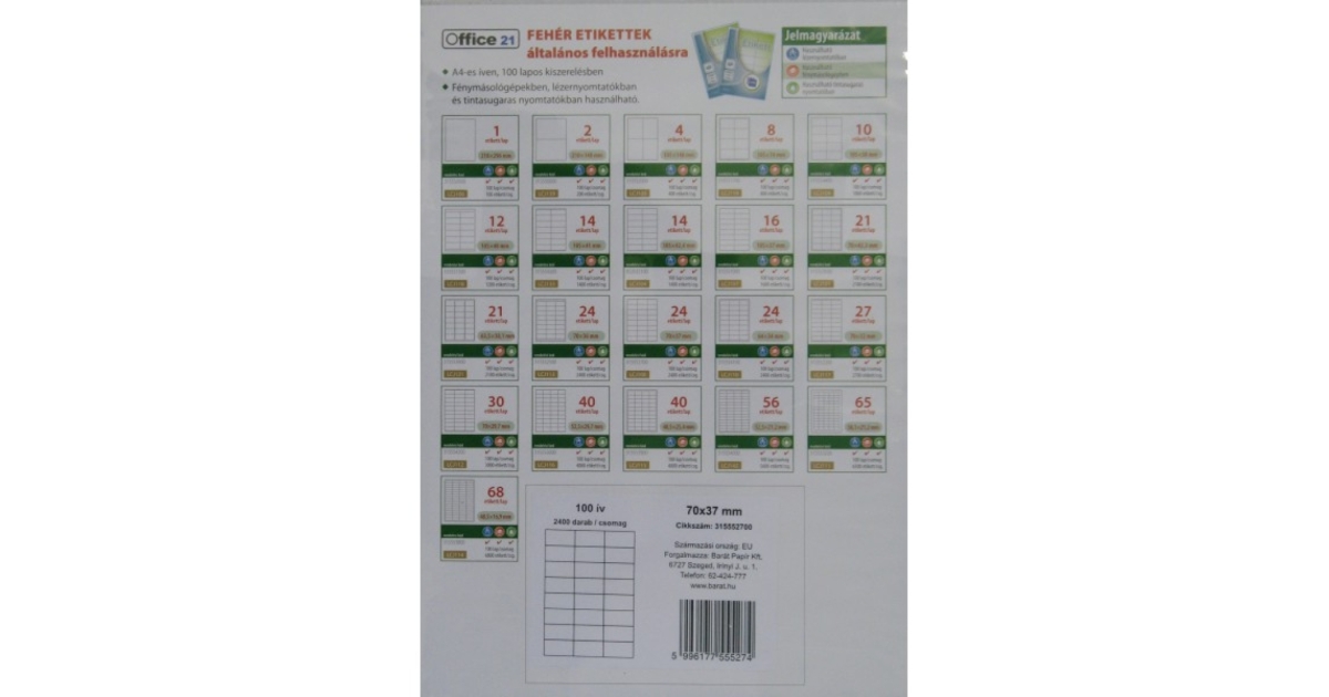 A/4-es íven található etikett, egy lapon 24db etikett található. Fénymásolóban, lézer és tintasugaras nyomtatókban egyaránt használható. Méretei:70x37mm