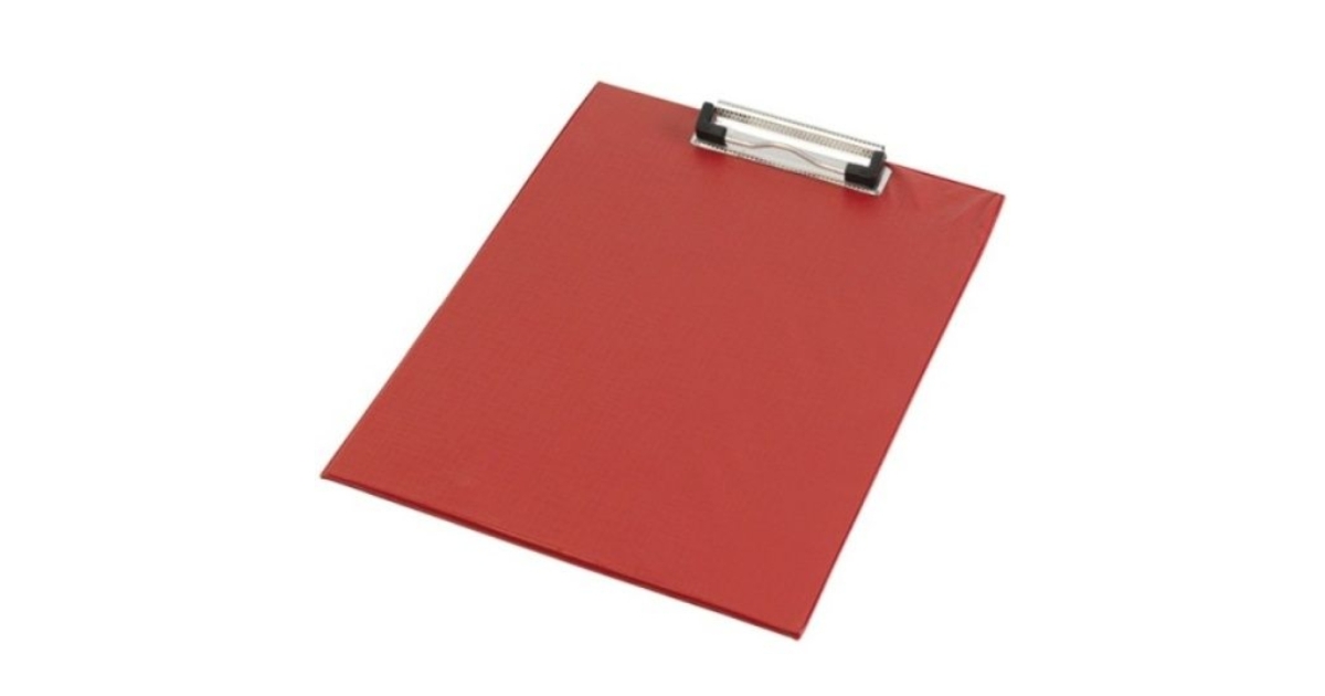 Kemény karton felírótábla, vízálló műanyag borítással, fém leszorító csipesszel.