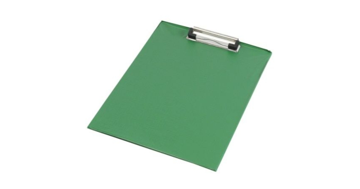 Kemény karton felírótábla, vízálló műanyag borítással, fém leszorító csipesszel.