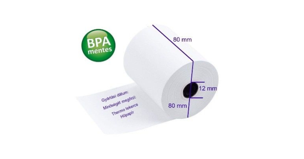 Pénztárgéphez használt 1 példányos, thermotekercs, BPA mentes hőpapírból készült gépszalag. Tekercs szélessége: 80 mm, tekercs átmérője: 80 mm, belső átmérő: 12 mm. Szalag hosszúsága: 75 m. Hátoldala dátum nyomott. A tekercs átmérője tájékoztató adat, mely változhat a papír vastagságától függően!