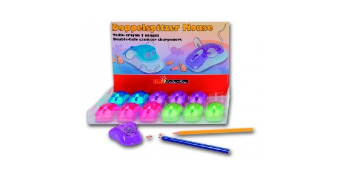Számítógépes "egér" alakú 2lyukú műanyag hegyező, mely vastag és vékony ceruzák hegyezésére is alkalmas. Mérete:8,6 x 4,7cm
