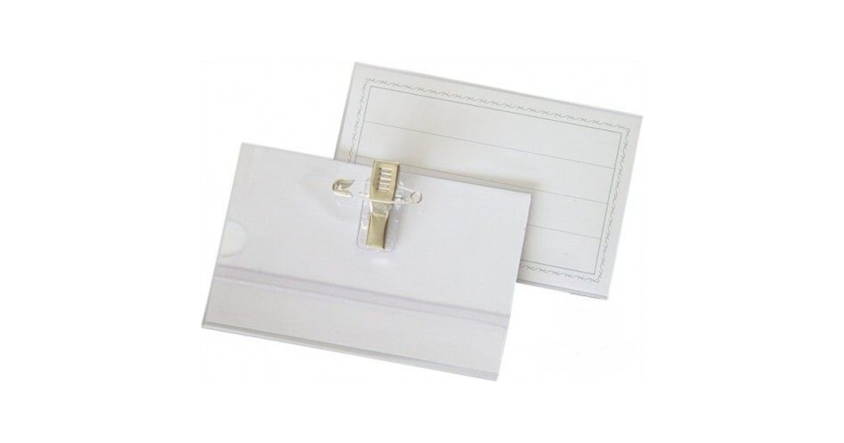 Névjegykitűző, átlátszó műanyagból, cserélhető kártyával.