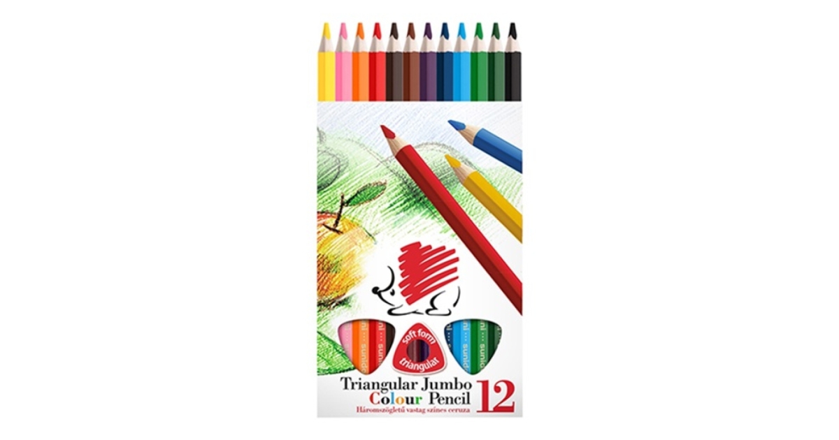 Kiváló minőségű és színintezitású háromszögletű színes ceruza, vastag színes, lakkozott ceruzatest.