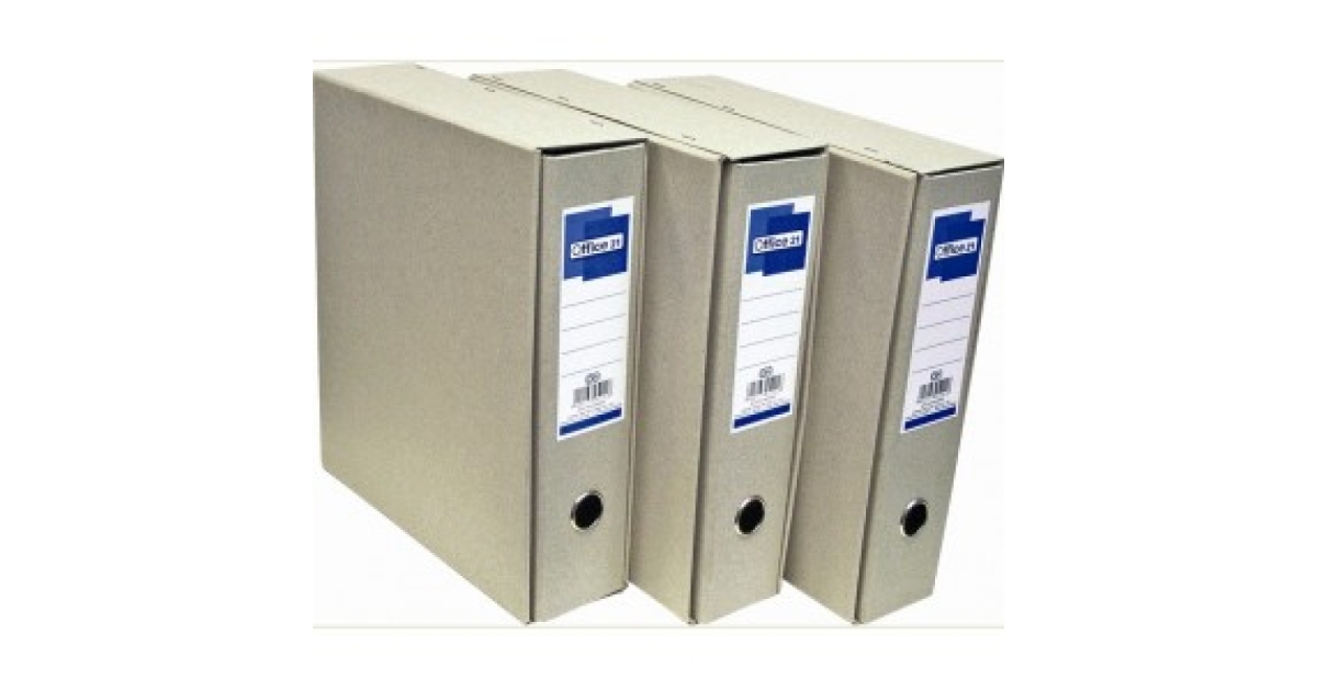 Natúr kartonból készült egyszerű kivitelű, emelőkaros szerkezettel ellátott tokos iratrendező, ragasztott címkével.