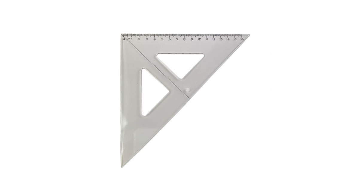 Átlátszó, műanyag, háromszög vonalzó 45 fokos 16 cm élű.