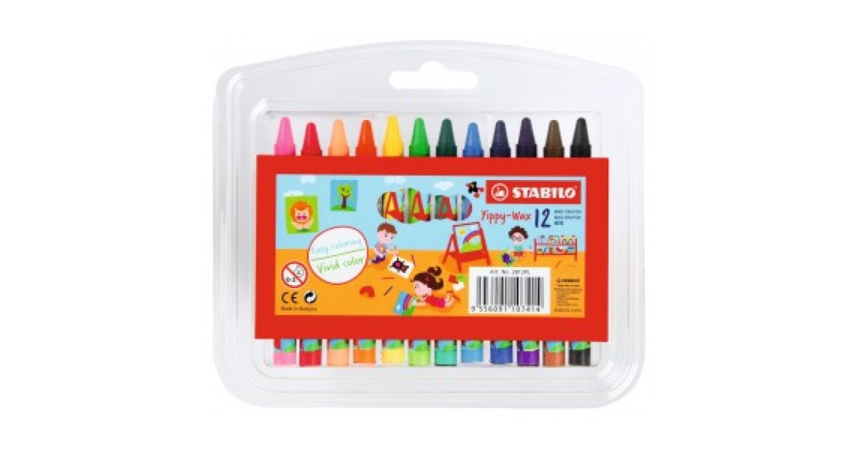Puha, nagyon kényelmes színes Stabilo Yippy-Wax zsírkréta készlet. A csomag 12 db zsírkrétát tartalmaz